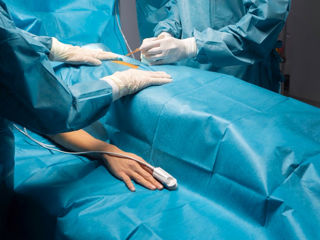 1. O paciente é posicionado confortavelmente, em ambiente estéril e monitorado;